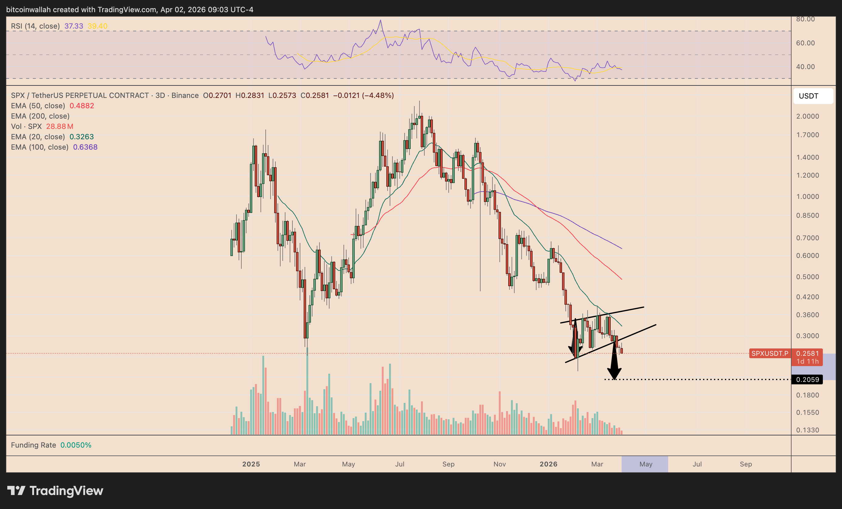 $SPX ya ha comenzado a perder la línea de tendencia inferior de la cuña cerca de USD 0,26 y se mantiene por debajo de sus medias móviles exponenciales de 20, 50 y 100 períodos, lo que subraya un débil impulso.