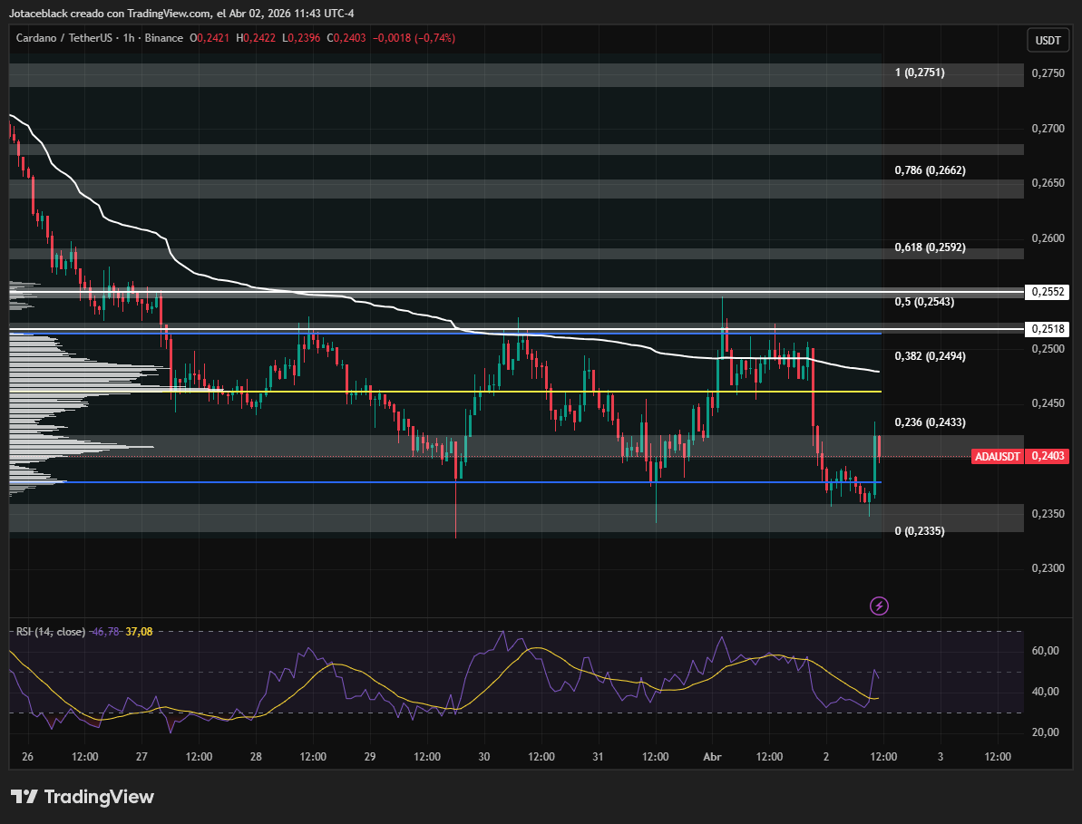 En la temporalidad 1H del par $ADA/USDT, el precio registra un rebote técnico claro tras reaccionar en el VAL del volume profile, en torno a los $0,2350. Este nivel actuó como soporte efectivo, evidenciando rechazo por parte de los vendedores.