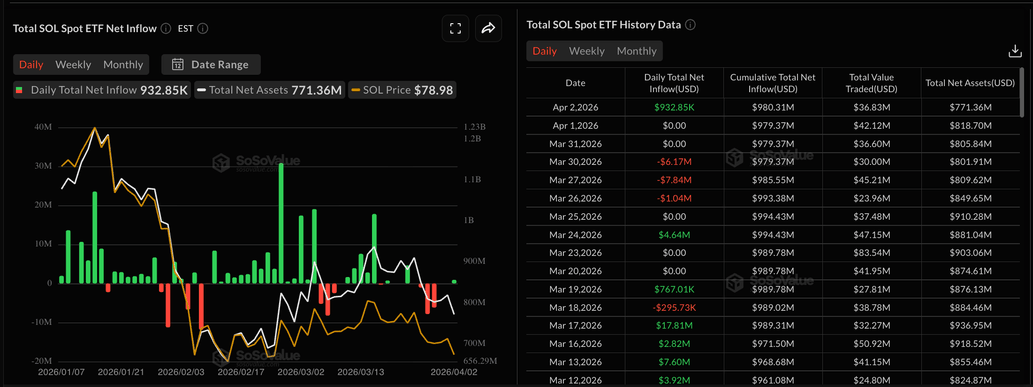 La demanda institucional de Solana mostró signos de recuperación el jueves, tras una salida de 6.17 millones de dólares el lunes. Los ETFs al contado de Solana en EE.UU. registraron entradas por 932.850$ el jueves, después de dos días de actividad moderada. Esto marca la primera entrada desde el 24 de marzo, sugiriendo una posible nueva fase de acumulación institucional.