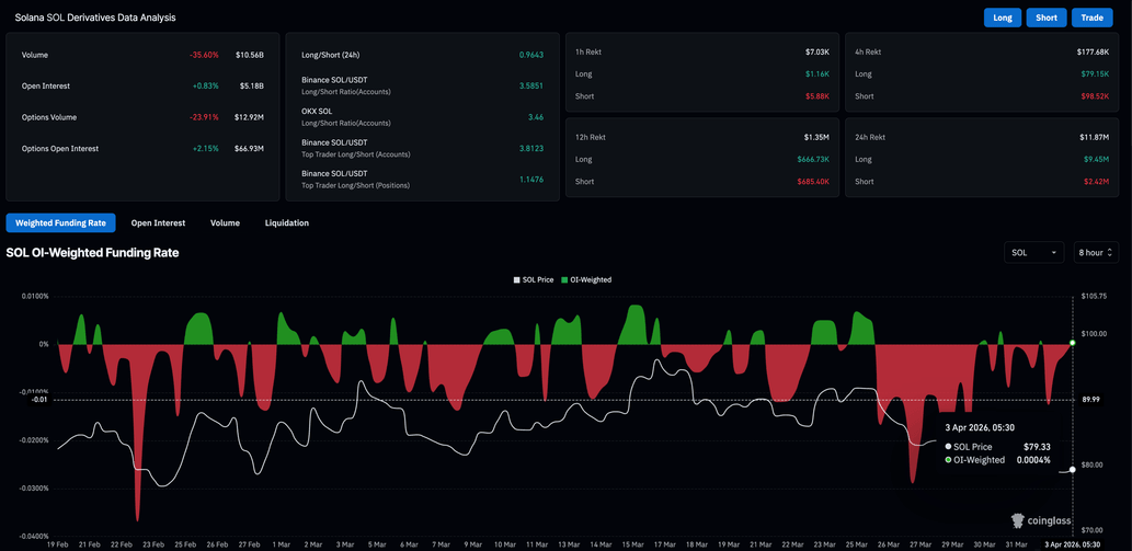 La actividad alcista en los derivados de Solana está a la defensiva, ya que las liquidaciones en las últimas 24 horas totalizan 11.87 millones de dólares, lideradas por 9.45 millones de dólares en liquidaciones largas, lo que indica que las apuestas alcistas están siendo forzadas a salir en medio de una fuerte caída del precio al contado. Las liquidaciones largas elevadas suelen conducir a un desequilibrio posicional debido a un mayor número de posiciones cortas activas, como lo evidencia la relación largo-corto de 0.9643.