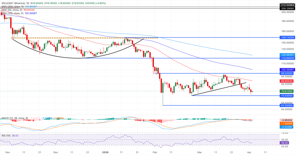 $SOL/$USDT cotiza a 79.61$ al momento de escribir el viernes. El par se mantiene muy por debajo de las medias móviles exponenciales agrupadas de 50, 100 y 200 días, que todas se sitúan por encima de 89$ y confirman un contexto bajista dominante.