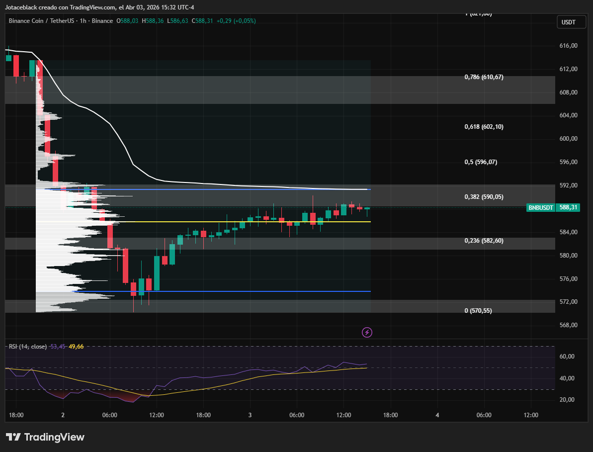 En la temporalidad 1H, el par $BNB/$USDT muestra una fase de lateralización tras el impulso reciente desde los $572 hasta la zona de $590. Este comportamiento sugiere una pausa del mercado luego del rebote, con el precio moviéndose en un rango estrecho mientras los participantes evalúan el siguiente movimiento.