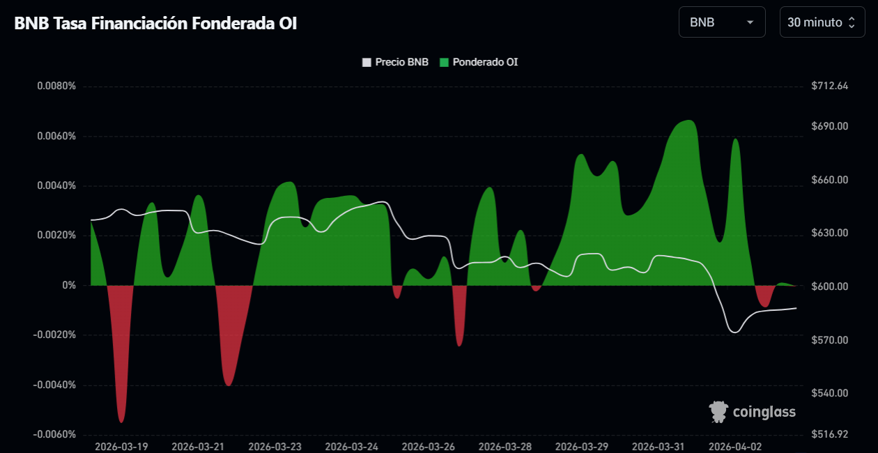 El gráfico de funding rates de $BNB muestra un comportamiento particularmente relevante en su tramo más reciente. Tras varios episodios de financiamiento positivo, donde los traders pagaban por mantener posiciones largas, el indicador comienza a perder fuerza y converge hacia la zona neutral, justo cuando el precio entra en una fase de lateralización tras la caída reciente.