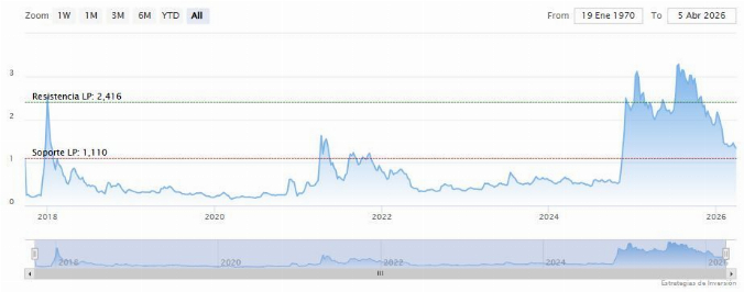 El precio no logra recuperar ni siquiera los niveles de resistencia a corto plazo y actualmente ronda los 1,30 dólares. Desde un punto de vista técnico, nada indica fortaleza.