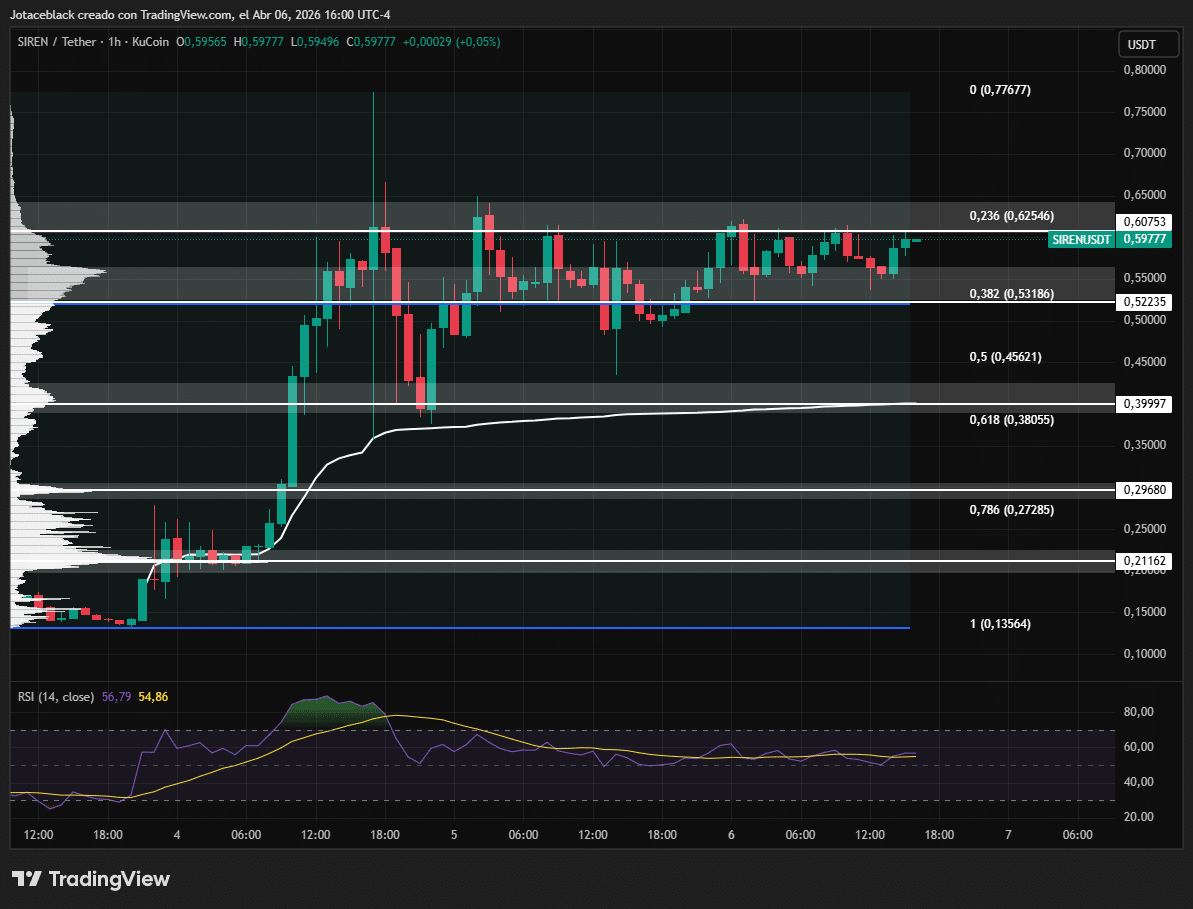 En la temporalidad 1H, el par $SIREN/$USDT se mantiene presionando una zona relevante en torno a los $0,60–$0,62, correspondiente al nivel 0,236 de Fibonacci, donde comienza a evidenciarse rechazo tras varios intentos de continuación.