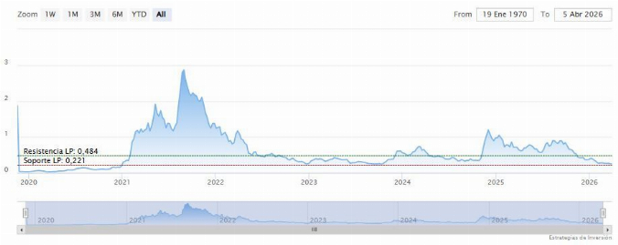 El soporte a mediano y largo plazo se encuentra en los 0.22 dólares. Mientras, los indicadores de Ei se muestran mixtos.