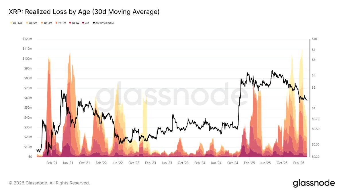 De hecho, los inversores que acumularon $XRP por encima de USD 2 durante los últimos 12 meses “han estado realizando pérdidas a un ritmo de USD 20 millones a USD 110 millones por día desde noviembre de 2025”, agregó Glassnode.