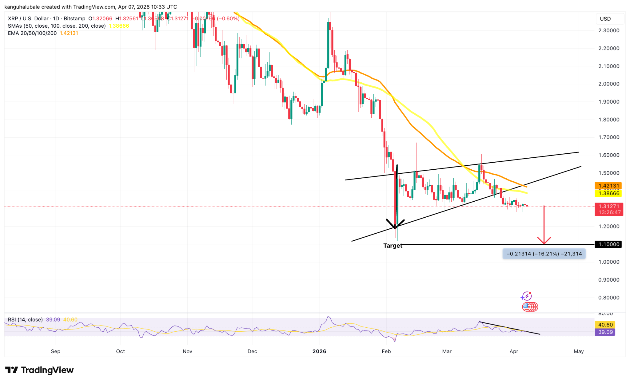 Si $XRP no logra recuperar la línea de tendencia y los promedios móviles, la configuración apunta a un movimiento más profundo hacia el objetivo medido del patrón cerca de USD 1,10, aproximadamente un 16% por debajo de los niveles actuales.