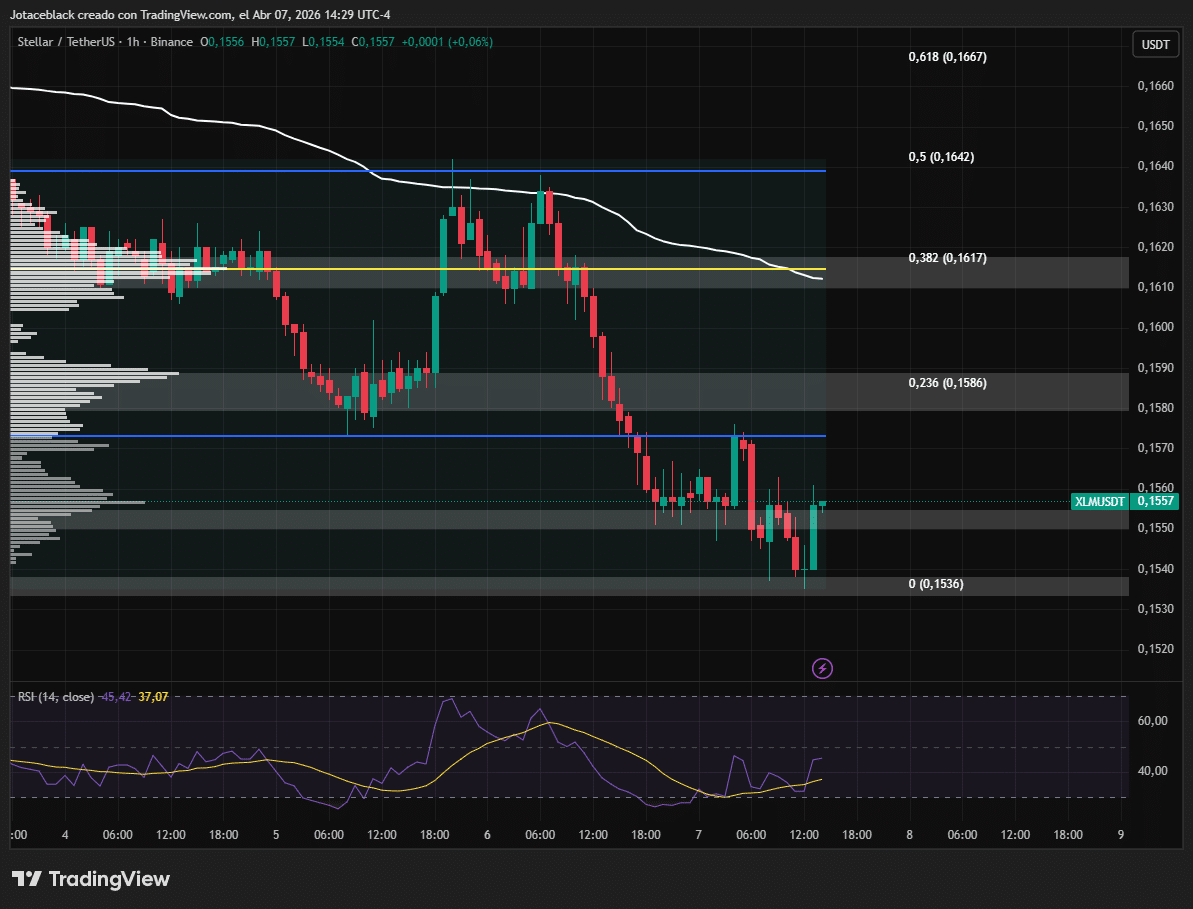 En las últimas sesiones, Stellar ha mantenido presión bajista, alcanzando un mínimo intradía en torno a los $0,1536. Desde ese nivel, el precio ha reaccionado con un rebote moderado, recuperando terreno hasta la zona de $0,1557, donde se mantiene actualmente.