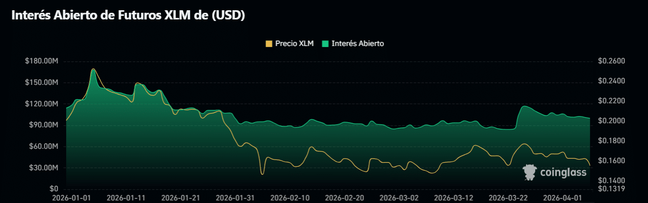 A lo largo de 2026, el interés abierto de Stellar ha mostrado una estructura de debilitamiento progresivo, con una secuencia de máximos decrecientes que evidencia una reducción constante en la exposición de los participantes.