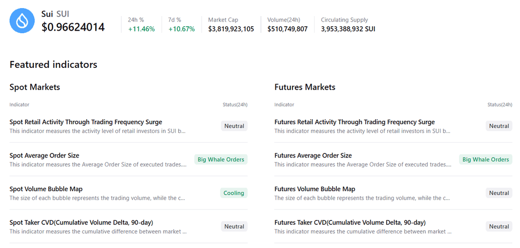 Los datos resumidos de CryptoQuant también respaldan una perspectiva alcista, ya que los mercados spot y de futuros de $SUI muestran grandes órdenes de ballenas con condiciones mayormente neutrales en otros indicadores, lo que sugiere un posible movimiento al alza.
