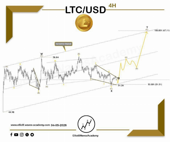 Al proporcionar una perspectiva actualizada para Litecoin ($LTC) en el marco temporal de 4 horas, Elliott Waves Academy señaló que la reciente acción del precio comienza a mostrar señales de una posible reversión. La estructura actual sugiere que el mercado podría estar saliendo de una fase correctiva prolongada, con un cambio gradual del impulso a medida que el patrón madura.