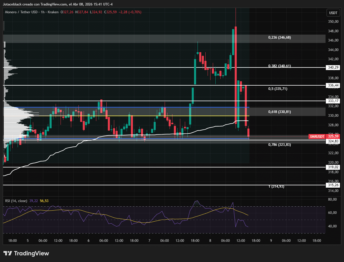 Al momento de redactar esta nota, el par $XMR/$USDT se encuentra testeando una zona que previamente actuó como soporte relevante en torno a los $325, nivel que vuelve a ponerse a prueba tras un movimiento especialmente agresivo.