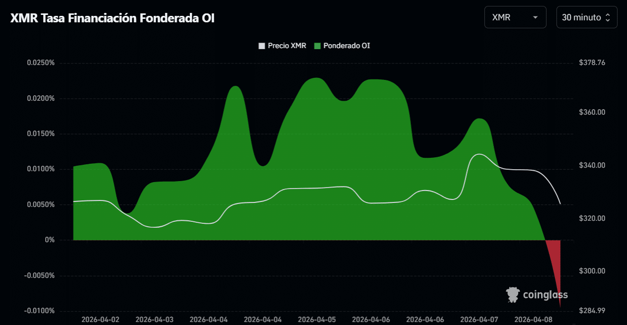 El gráfico de funding rates de $XMR muestra un sesgo alcista sostenido en fases previas. El financiamiento se mantuvo en terreno positivo durante varios tramos, lo que indica que los traders estaban pagando por mantener posiciones largas.