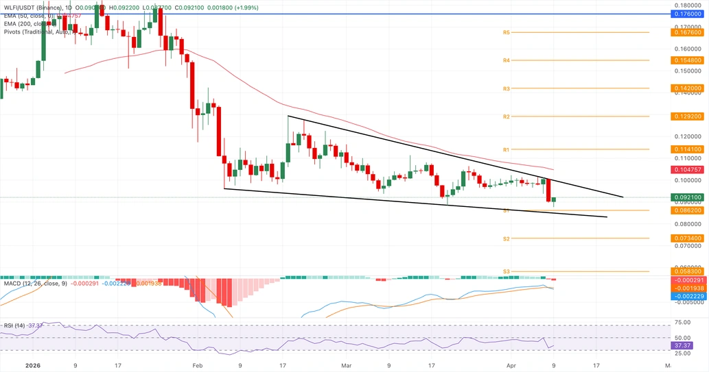 World Liberty Financial cotiza por debajo de 0.1000$ al momento de la publicación el jueves, extendiendo una fase bajista con el precio manteniéndose muy por debajo de la Media Móvil Exponencial (EMA) de 50 días en 0.1048$ y la línea de tendencia de resistencia descendente más amplia que se origina cerca de 0.1294$.