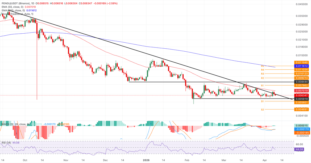 El soporte inmediato para $PENGU se encuentra en el mínimo del 5 de febrero en 0.005919$, seguido por el Punto Pivote S1 en 0.005601$.