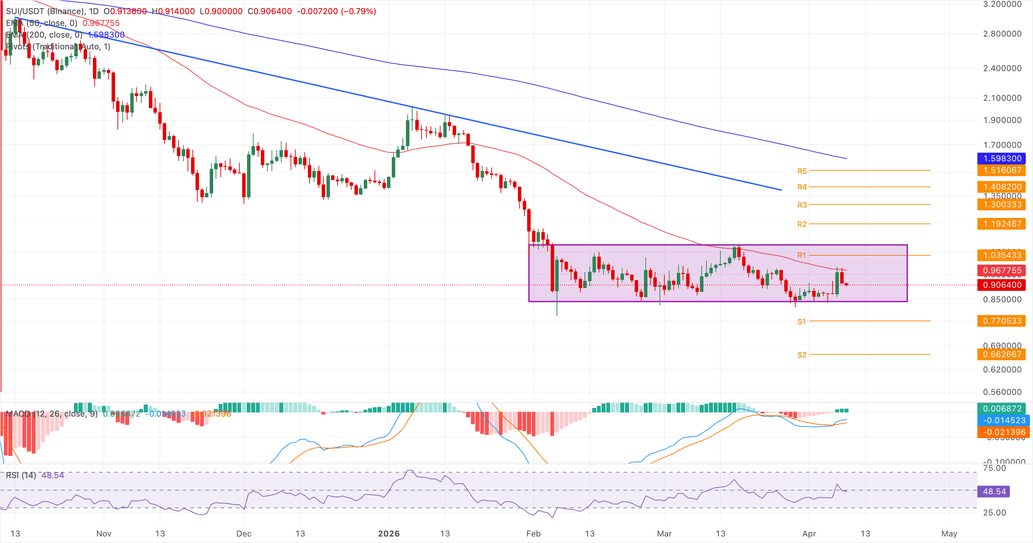 Sui se mantiene alrededor de 0.90$ al momento de escribir el jueves, manteniendo un tono bajista a corto plazo ya que se mantiene muy por debajo tanto de la EMA de 50 días en 0.9678$ como de la EMA de 200 días en 1.5983$. El precio continúa dentro de una zona de consolidación entre 0.84$ y 1.08$.
