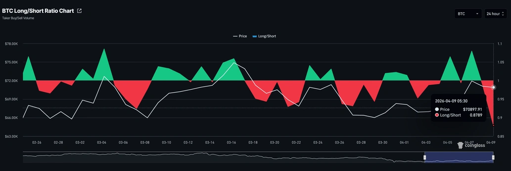 Sin embargo, los datos de CoinGlass muestran una inclinación bajista en el mercado de derivados, con el ratio largo-corto de Bitcoin cayendo a 0.8789, lo que sugiere más posiciones cortas activas mientras los operadores apuestan a la baja.