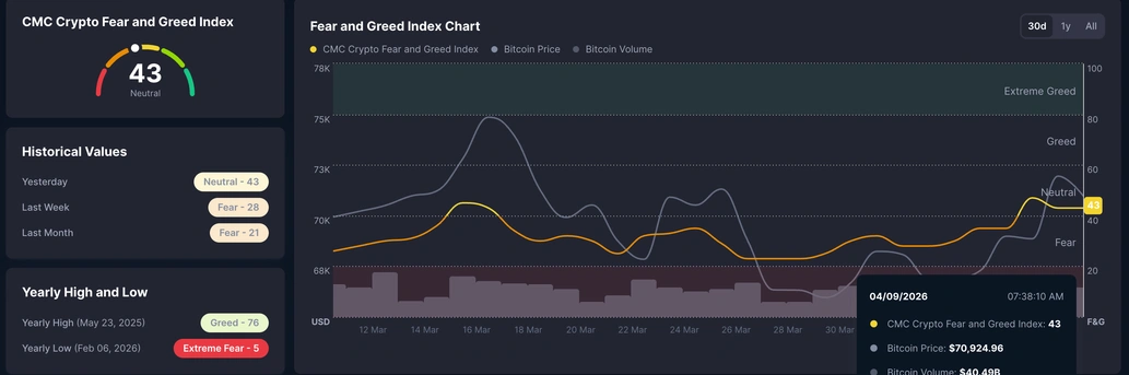 El mercado cripto más amplio se mantiene estable en medio de la presión geopolítica, con el Índice de Miedo y Codicia de CoinMarketCap en 43 el jueves, indicando una postura neutral.