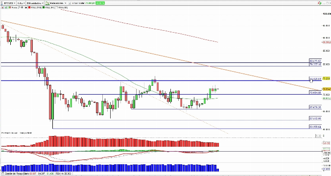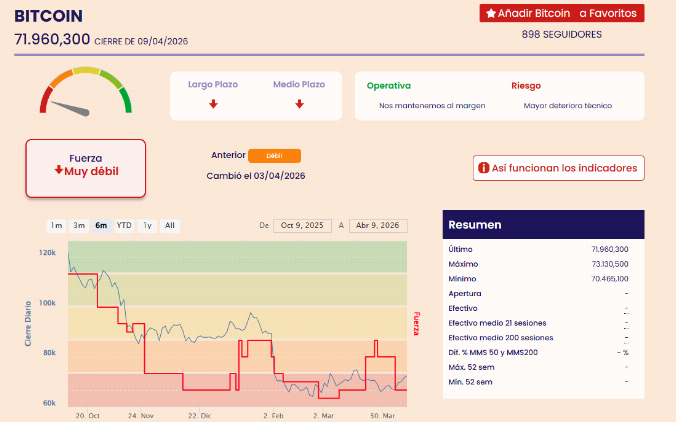 La primera de ellas es que el Bitcoin está remontando en bolsa a corto plazo, sin que eso signifique que debamos entrar en el activo, pero vemos que mantiene una actitud positiva, logrando situarse nuevamente por encima de su media móvil simple de 50 sesiones, la cual ya tiene pendiente positiva y podría actuar como soporte. Mientras el precio no cierre por debajo del nivel clave de los 70.084,88, el objetivo al alza se sitúa en el entorno de los 74.426,01.