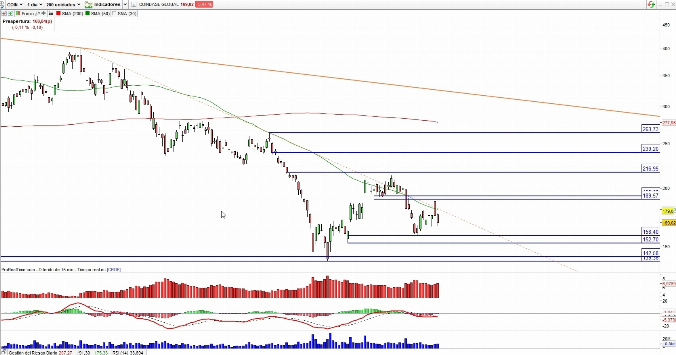 Coinbase se encuentra inmersa en caídas con un área de techo o resistencia entre los 189,57 y 192,63 dólares por acción. El escenario más probable es que el precio retroceda para buscar apoyo en los soportes ubicados entre los 152,70 y 158,40 dólares.