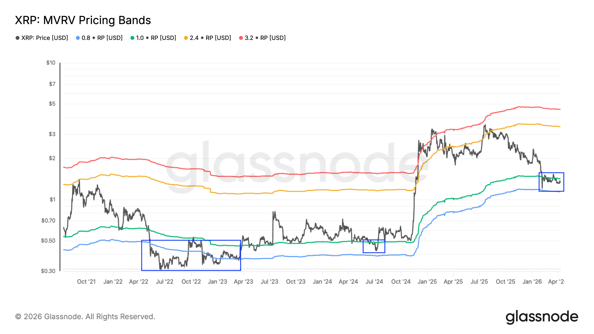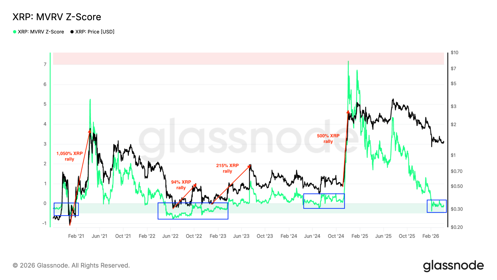 Ten en cuenta que la última vez que el MVRV Z-score de $XRP cayó a niveles similares a finales de 2024, coincidió con un suelo de mercado macro en 0,30 dólares y precedió a un repunte de varios meses, con el par $XRP/USD subiendo un 500% a un máximo de varios años por encima de 3 dólares.