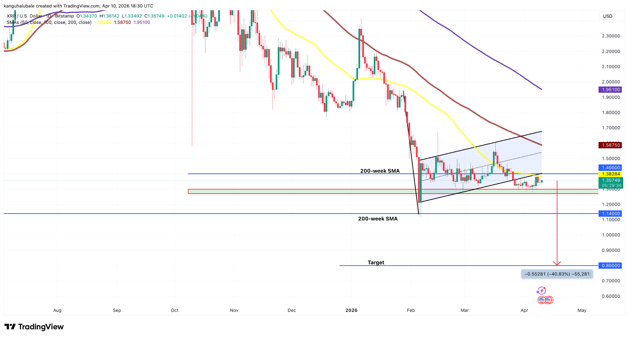 Si $XRP/USD cae por debajo de este nivel, estaría en caída libre hacia el objetivo medido de la bandera bajista en 0,80 dólares, o un 41% por debajo del precio actual.