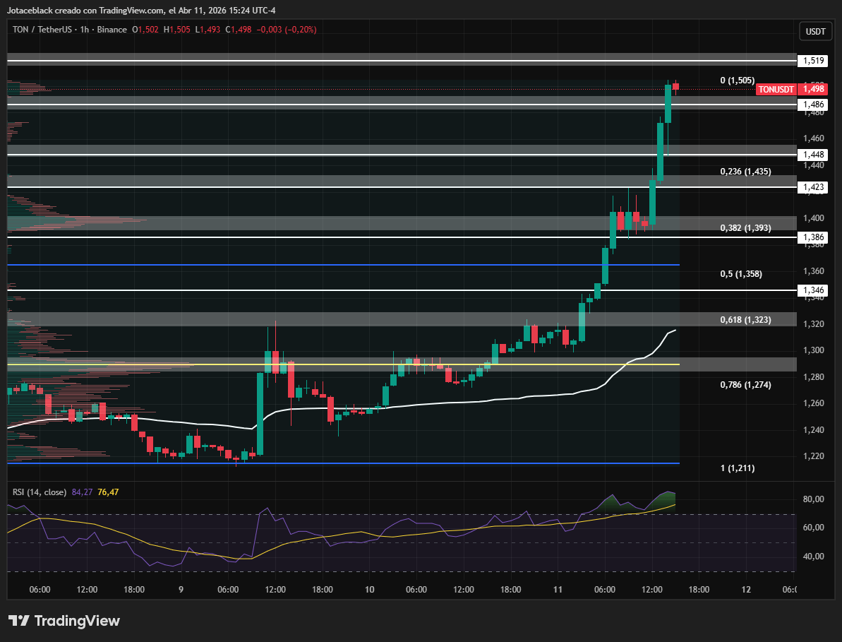 A pesar del entusiasmo que ha acompañado el reciente impulso, la subida de Toncoin comienza a mostrar señales de agotamiento en el corto plazo. En la temporalidad 1H, el RSI (14) se mantiene en niveles de sobrecompra, un contexto que históricamente suele preceder fases de corrección o, al menos, de consolidación.