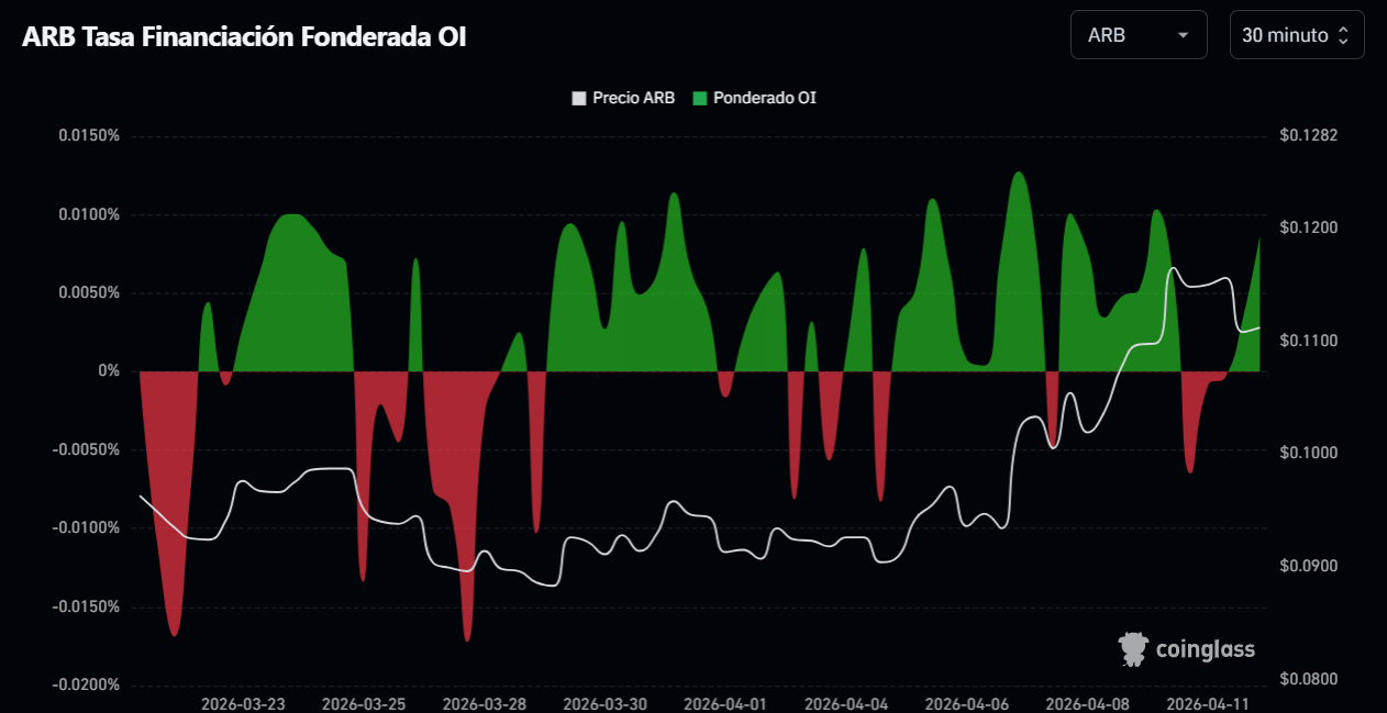 El comportamiento reciente del funding en Arbitrum deja una señal relevante en su tramo final. A pesar del retroceso del precio desde los $0,1228 hasta los $0,1098, el indicador muestra cómo el financiamiento vuelve a posicionarse con fuerza en territorio positivo, reflejando un aumento en la apertura de posiciones largas.