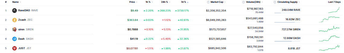 Del 7 al 13 de abril, $ZEC registra una subida de precio del 42%, mientras que $DASH del 33,35%.