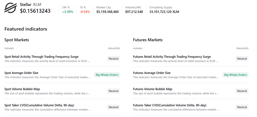 De manera similar, para $XLM, los mercados spot y de futuros muestran grandes órdenes de ballenas bajo condiciones mayormente neutrales en otras métricas, sugiriendo una perspectiva alcista.
