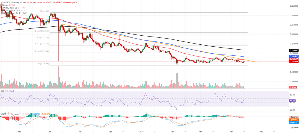En el lado bajista, el soporte estructural clave se sitúa cerca del ancla de Fibonacci alrededor de 0.136$, donde se esperaría que los compradores defiendan la base más amplia si se reanuda la venta.