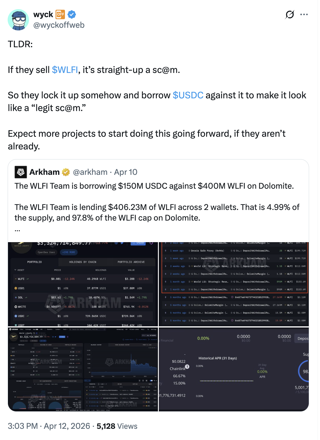Datos on-chain de Arkham Intelligence muestran que billeteras vinculadas al proyecto depositaron aproximadamente entre 3.000 y 5.000 millones de tokens $WLFI, en gran parte ilíquidos, como garantía en Dolomite para pedir prestados unos 75 millones de dólares en stablecoins, incluidos USD1 y USDC.