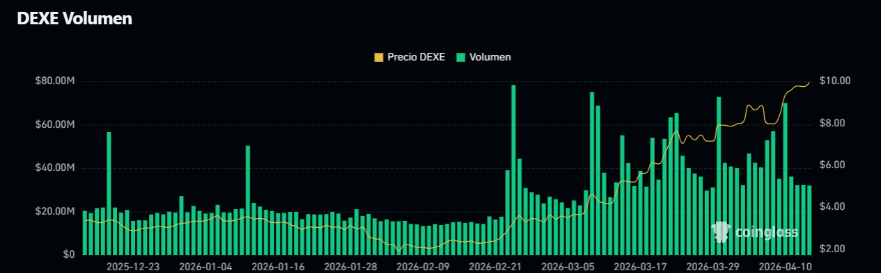 El comportamiento reciente de $DEXE comienza a mostrar señales que van más allá del simple movimiento del precio. En el gráfico, el volumen ha pasado de una base relativamente estable en torno a los $15–20 millones a picos que rozan los $70–80 millones. Esto representa un incremento superior al +200%.