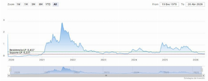 El soporte a mediano plazo se encuentra en los 0.23 dólares. Mientras, los indicadores de Ei se muestran mixtos.