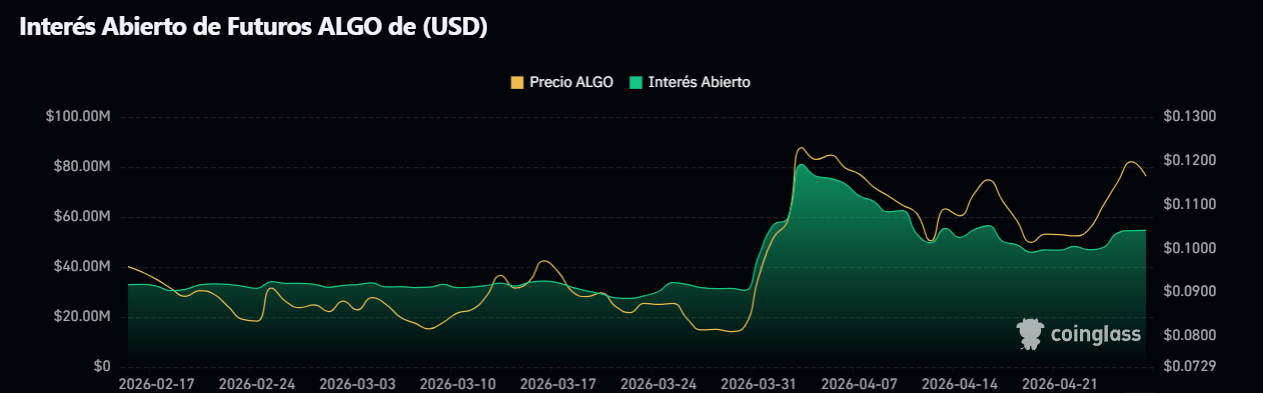 Desde el 30 de marzo se observa un cambio claro en la estructura del mercado de Algorand: el interés abierto se dispara desde niveles cercanos a los $30M hasta superar los $80M, en línea con una fuerte subida del precio.