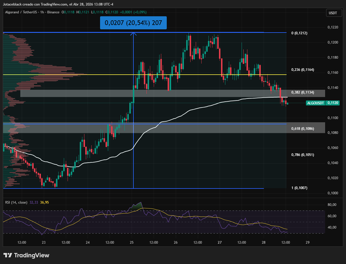 En el gráfico del par $ALGO/$USDT en temporalidad 1H se aprecia un retroceso tras alcanzar un máximo reciente en torno a los $0,1212. Desde ese nivel, el precio corrigió hasta la zona de $0,1120, donde se mantiene al momento de la redacción.