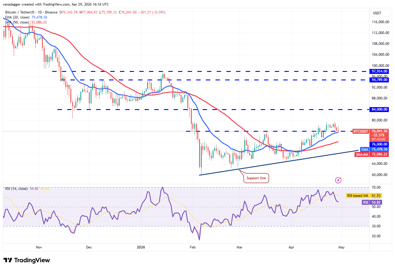 La EMA de 20 días es el soporte crítico a corto plazo a tener en cuenta. Si el precio de $BTC rebota con fuerza desde la EMA de 20 días y rompe por encima de 80.000 dólares, indica que los alcistas han convertido el nivel de 76.000 dólares en soporte. El par $BTC/$USDT podría entonces subir hasta los 84.000 dólares.