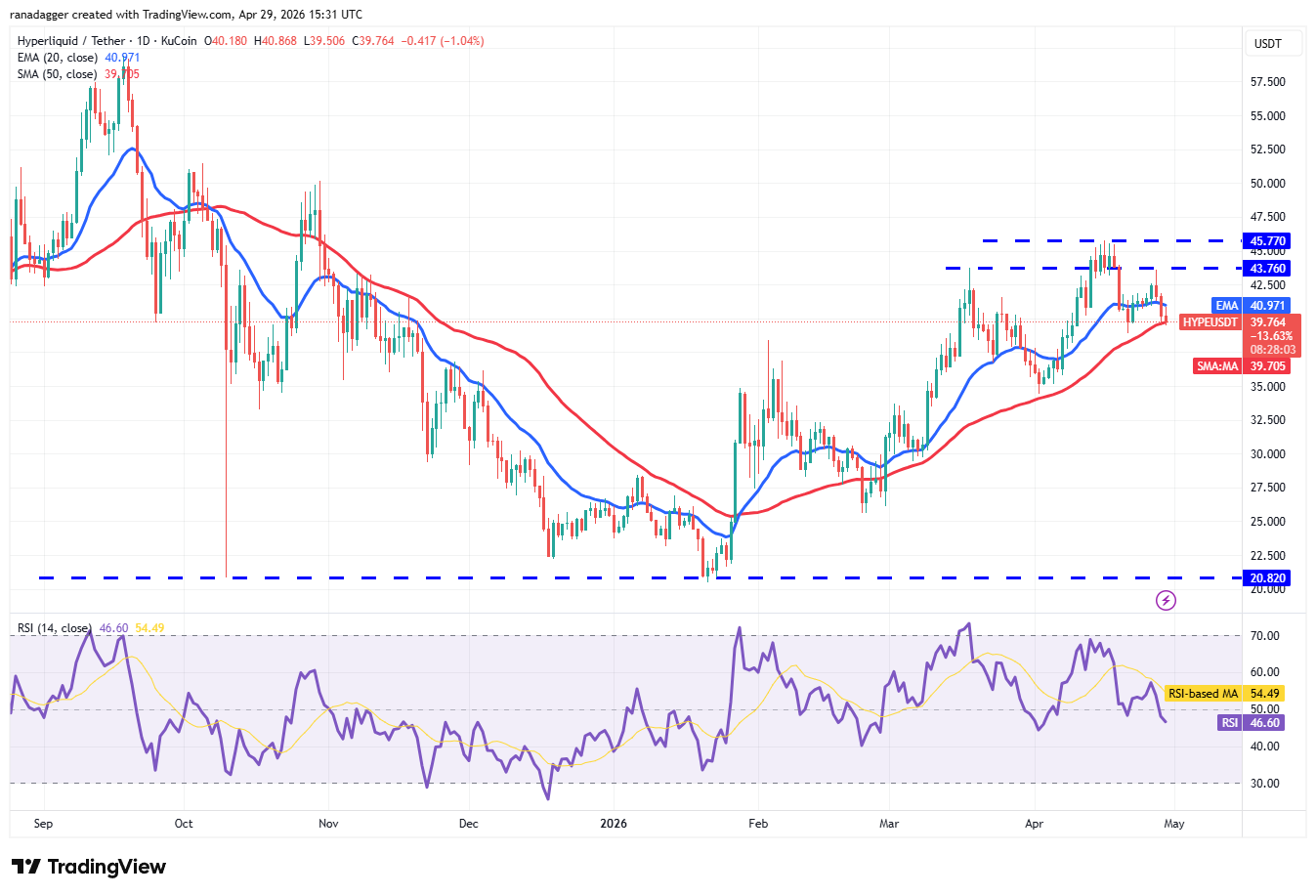 Hyperliquid ($HYPE) bajó desde la resistencia superior de 43,76 dólares el lunes y cayó a la SMA de 50 días (39,70 dólares) el martes.