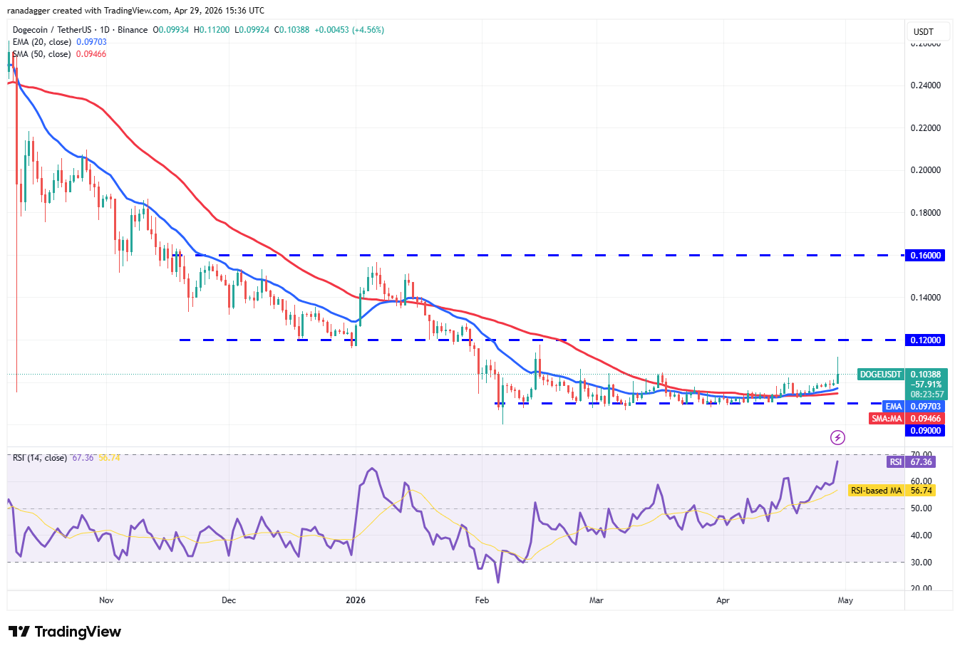 Dogecoin ($DOGE) rebotó en la EMA de 20 días (0,10 dólares) el lunes, indicando compras en las caídas.