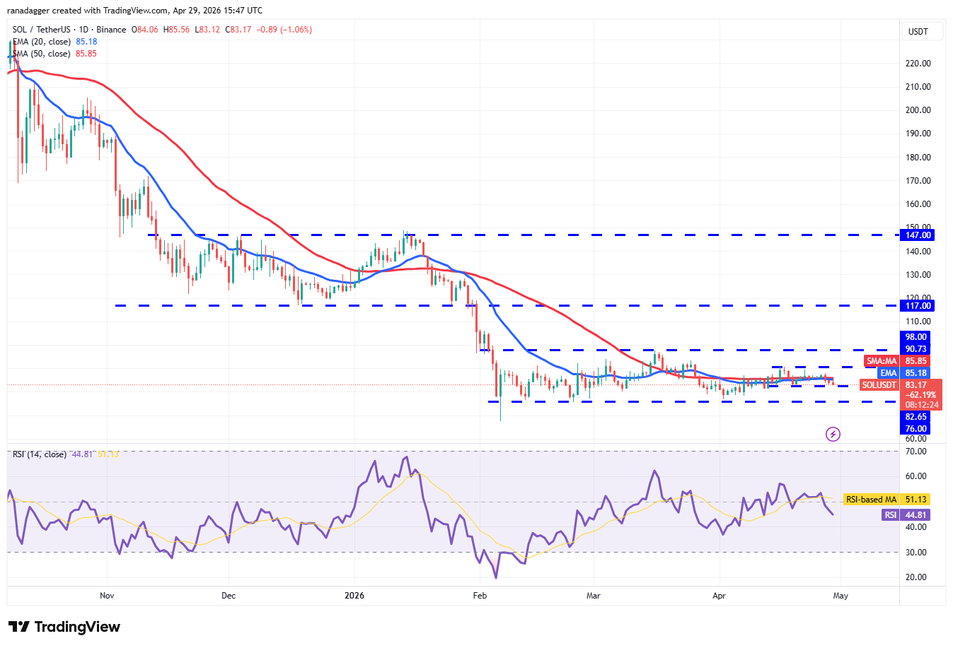 Si el precio rompe por debajo de 82,65 dólares, el par $SOL/$USDT podría descender hacia el soporte de 76 dólares. Se espera que los compradores defiendan ferozmente el nivel de 76 dólares, puesto que un cierre por debajo de este podría hacer que el par caiga a 67 dólares.