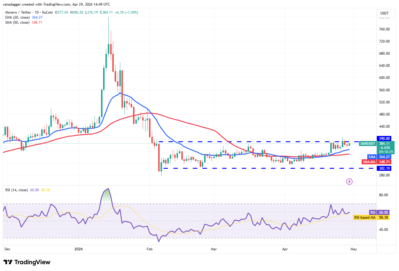 El precio de $XMR retrocedió hasta la EMA de 20 días (364 dólares), donde intervinieron los compradores. Si el par $XMR/$USDT sigue subiendo y supera el nivel de 406 dólares, señala el inicio de un nuevo movimiento alcista hacia 500 dólares.