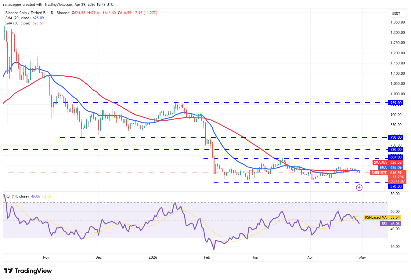 $BNB ($BNB) permanece atascado dentro del amplio rango entre 570 dólares y 687 dólares, lo que indica compras en las caídas y ventas en los repuntes.