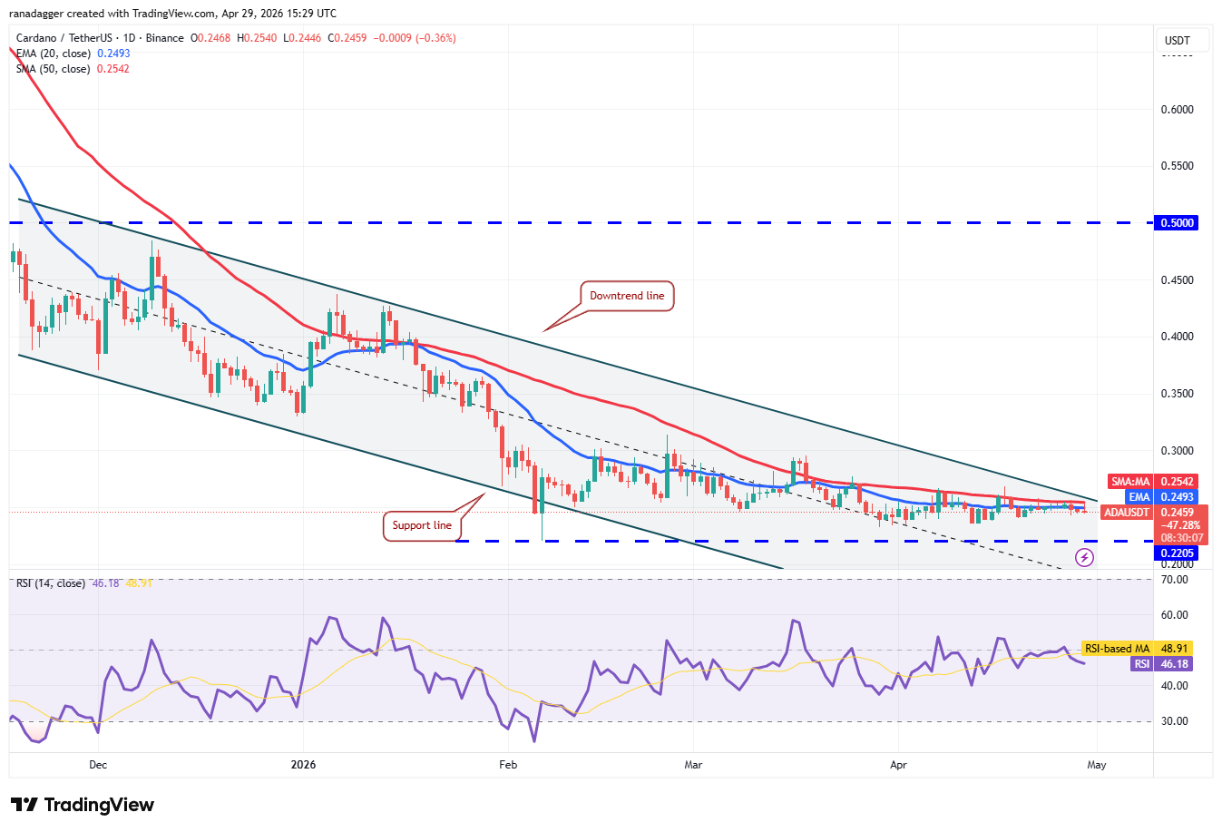 Eso sugiere que los alcistas intentarán de nuevo impulsar el precio de $ADA por encima de la línea de tendencia bajista. Si tienen éxito, el par $ADA/$USDT podría repuntar hasta 0,32 dólares y luego hasta 0,37 dólares. Dicho movimiento señala un posible cambio de tendencia.