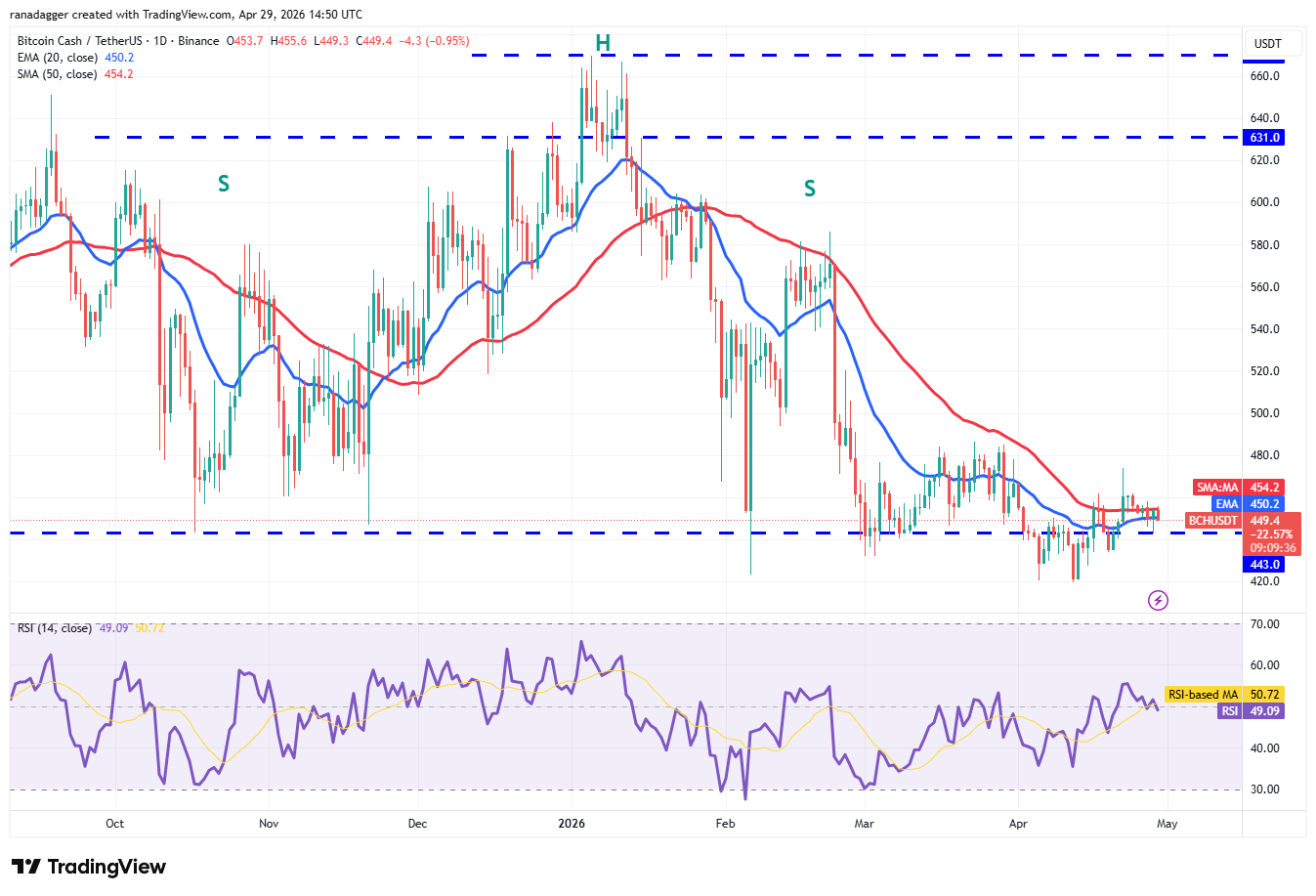 Bitcoin Cash ($BCH) rebotó en el soporte de 443 dólares el martes, pero los alcistas luchan por empujar el precio por encima de las medias móviles.