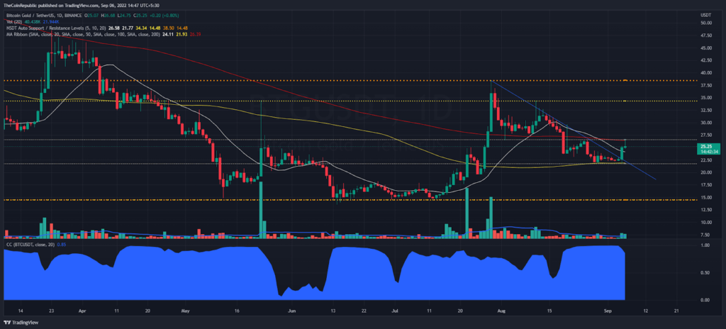 Bitcoin Gold Coin (BTG) sigue buscando en un rango horizontal por debajo de $26.5 a pesar de una ganancia del 14.5%. Ahora los bajistas intentan mantener el precio de BTC por debajo de la SMA de 200 días.