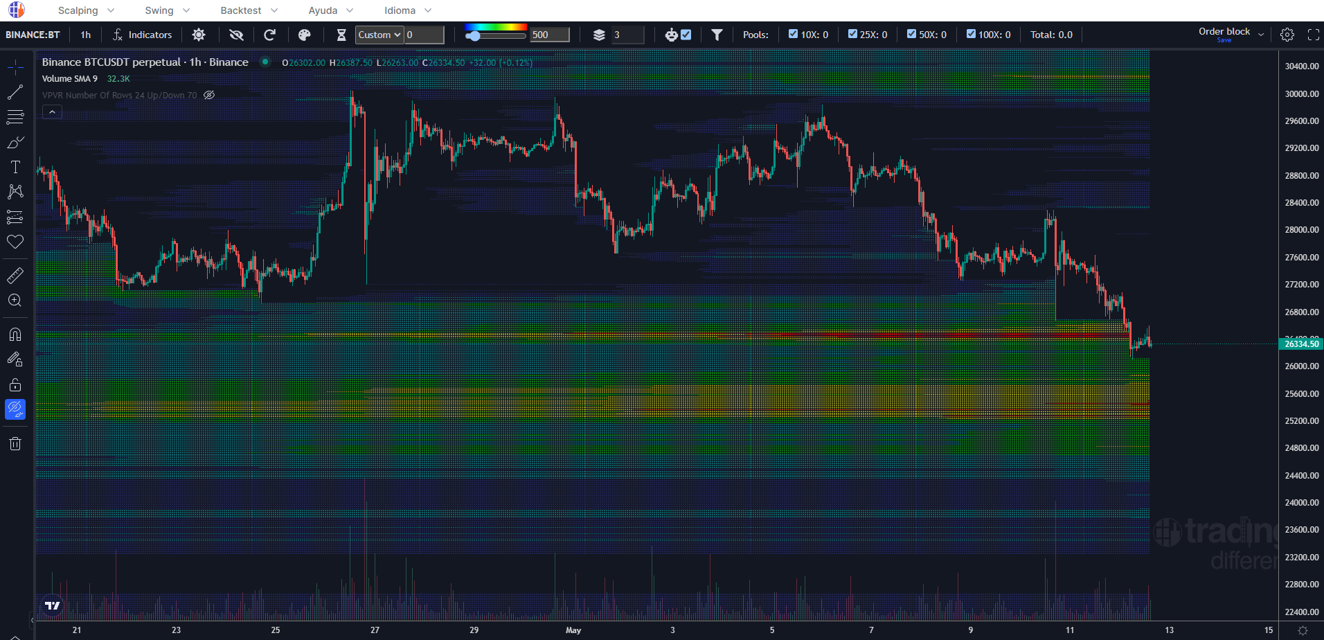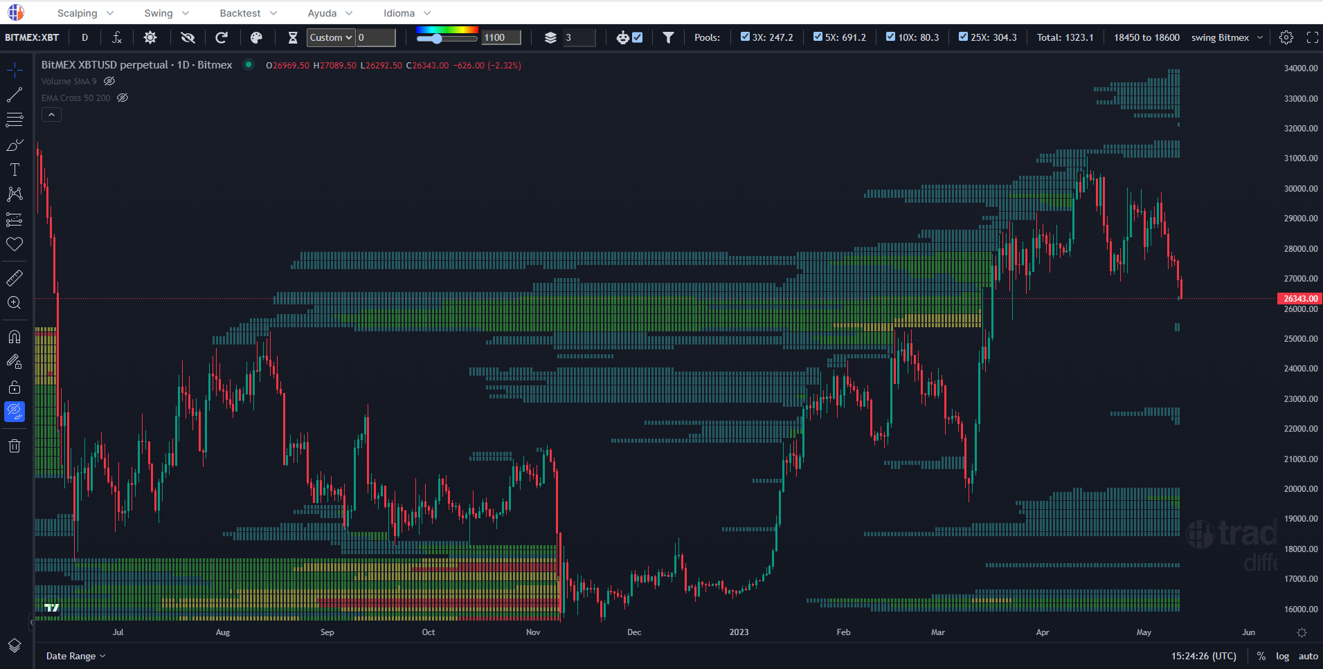 - Y aquellas liquidez que ya ingresó al mercado, pero se refleja como Puntos de Liquidación y Stop Loss. Este tipo de liquidez se puede observar con los Pools de Liquidaciones (gráfico 1).