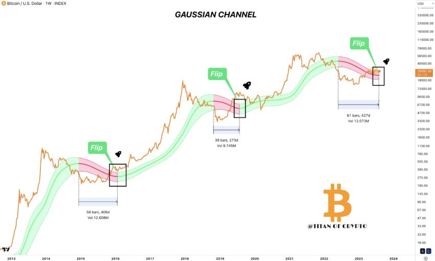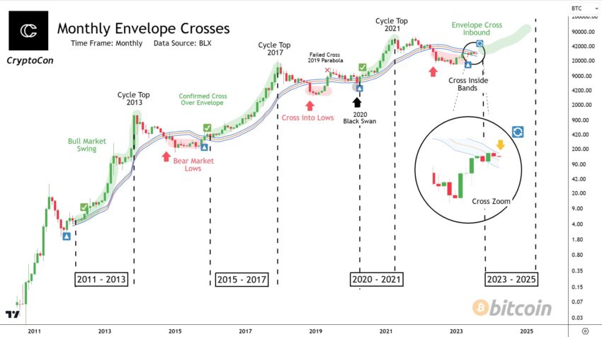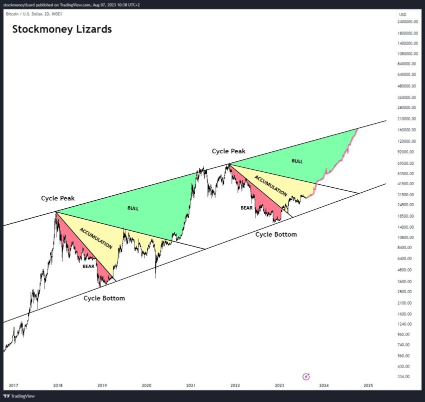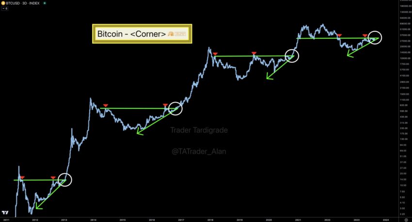 Él cree que el fin de la figura es un presagio de la subida de Bitcoin. Los momentos de “verdad” en el gráfico están marcados con círculos blancos. Según la lógica del autor, BTC está a punto de partir para conquistar nuevas alturas.
