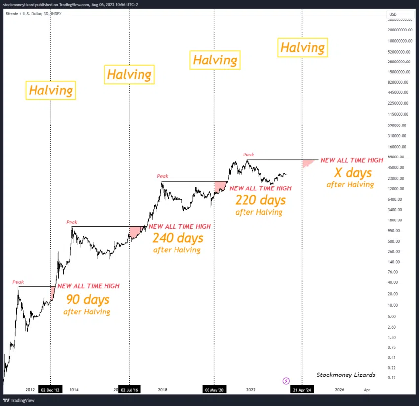 El autor del primer pronóstico trató de predecir cuánto costará Bitcoin en el momento del halving de 2024. Para ello, tomó como base la observación de que BTC, aproximadamente 220 días después del evento, actualiza su valor máximo absoluto.