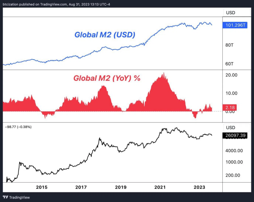 Ahora que la oferta monetaria mundial está en declive, los mercados de Bitcoin y criptomonedas también permanecen en territorio bajista. ¿Es esto una coincidencia o simplemente otra teoría novedosa?